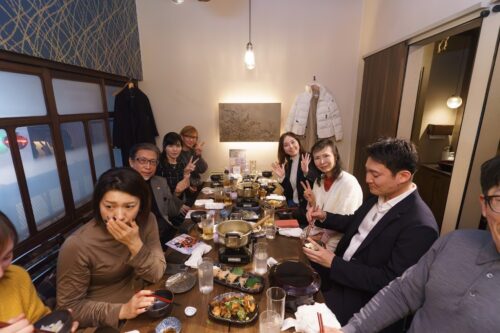 長いテーブルを囲んで、肩を寄せ合いながらの乾杯(^^)スーツ姿の方が多いのに、堅苦しさはまったくなくて、親戚が集まるような空気感でした。